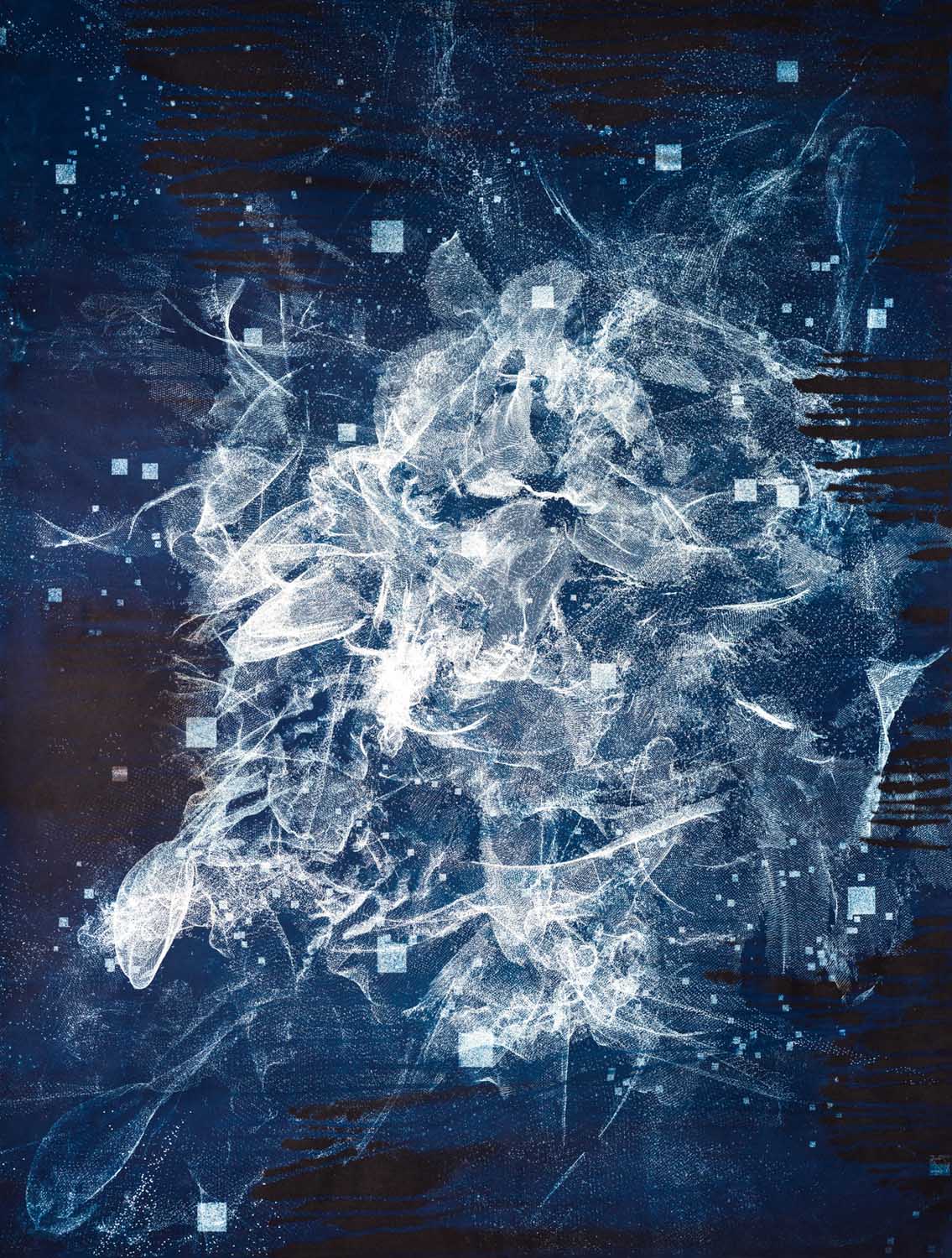 The 3D capturing involves infrared depth laser scanning technology to calculate data points of spatial information about the physical dimensions of four living plants. These dimensional portraits are photographed with a virtual camera from multiple perspectives and layered to compose digital negatives. The printing process explores the other end of the invisible light spectrum (ultraviolet light) through one of the oldest methods of photographic printing – cyanotype. As a contemporary ode to Anna Atkins, the project connects the most contemporary imagining technology with the first photographic method, in this way linking the ends of the light spectrum as we see it with the ends of historical time as we know it. All prints are partially developed so that sections of each image remain sensitive to UV light and thus slowly change in response to the precipitation and light in their environment. By flattening the 3D scans into dynamic topographic maps, the project deciphers a dimensional translation of material and digital memory systems.